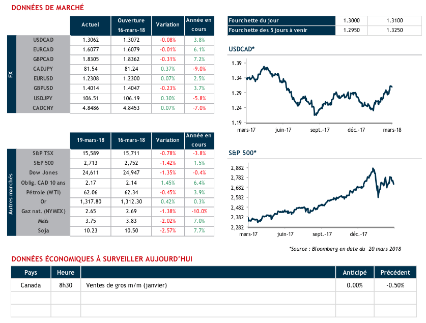 La saga de l’ALÉNA continue avec un certain vent d’optimisme du côté canadien. Hier, le Premier ministre Trudeau a déclaré que le président Trump semblait plutôt enthousiaste quant à l’issue des négociations. Son ministre des Finances, M. Morneau, a précisé que « nous faisons des progrès dans les négociations de l’ALÉNA ». Il n’y a toujours pas de date officielle pour une prochaine ronde de pourparlers, mais le mois d’avril est fortement envisagé. Seules des annonces communes et officielles feront bouger le CAD de façon significative. Nous pensons que les exportateurs devraient continuer à profiter des taux actuels. Dans une étude publiée hier, nos économistes pensent qu’un accord pourrait être trouvé dès le printemps et que la faiblesse du CAD est exagérée.