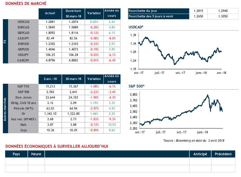 Turbulente en ce sens qu’en plus d’affecter la nervosité des marchés, le mouvement d’aversion au risque qui en découle affecte négativement le huard ainsi que les taux obligataires à long terme américains. Cette relation n’est certes pas étrangère à l’absence de réaction du huard hier à la déclaration du président Trump voulant qu’il souhaite pouvoir annoncer la semaine prochaine une entente sur l’ALÉNA.