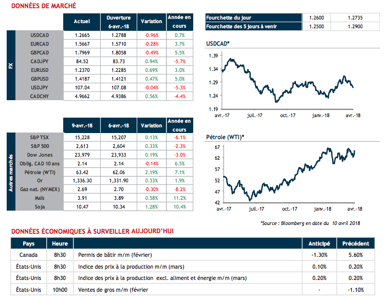 Suite à une excellente journée, le dollar canadien poursuit sa progression aujourd’hui. Le rebond des cours pétroliers et les commentaires du ministre mexicain de l’économie estimant à 80% les chances d’un accord sur l’ALÉNA d’ici le début du mois de mai prochain expliquent la récente vigueur. Le temps est compté pour les négociateurs américains alors que les élections de mi-mandat se tiendront le 6 novembre prochain. Nous surveillons aujourd’hui l’indice des prix à la production (IPP) à 8h30 aux États-Unis.