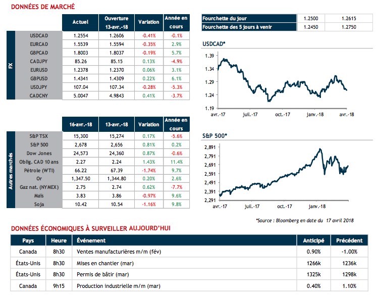 Niveau actions, les marchés ont entamé cette saison de résultats trimestriels du bon pied avec des gains (autant à New York qu’à Toronto). Plusieurs grandes entreprises américaines publiaient leurs résultats hier et cela se poursuivra au cours de la semaine. La progression des indices boursiers crée généralement un sentiment plus favorable à la prise de risque, ce qui tend à aider notre devise. Hier, le CAD a affiché des gains de près de 50 points face à l’USD.