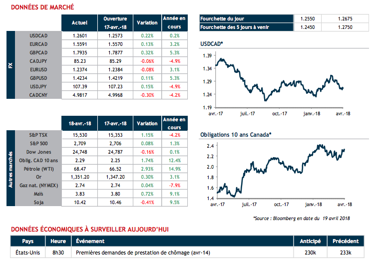 Les investisseurs ont semblé croire le gouverneur de la BdC, qui a utilisé sa tribune afin de tempérer les attentes reliées à une hausse de taux dès le mois prochain (30 mai). Les données feront foi de tout selon lui. Les probabilités d’une hausse en mai sont actuellement de 42%, contre 47% hier.