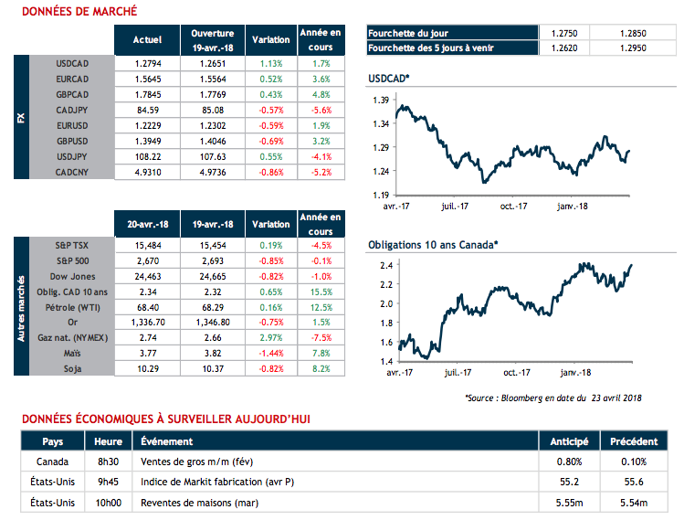 Le ton prudent de la Banque du Canada mercredi ainsi que les données économiques canadiennes décevantes de vendredi (inflation et ventes au détail) donnent le ton aujourd’hui : un huard qui faiblit et un taux USDCAD qui poursuit son rebond.