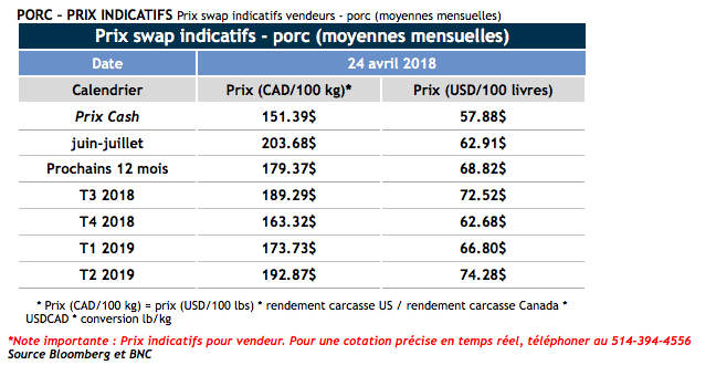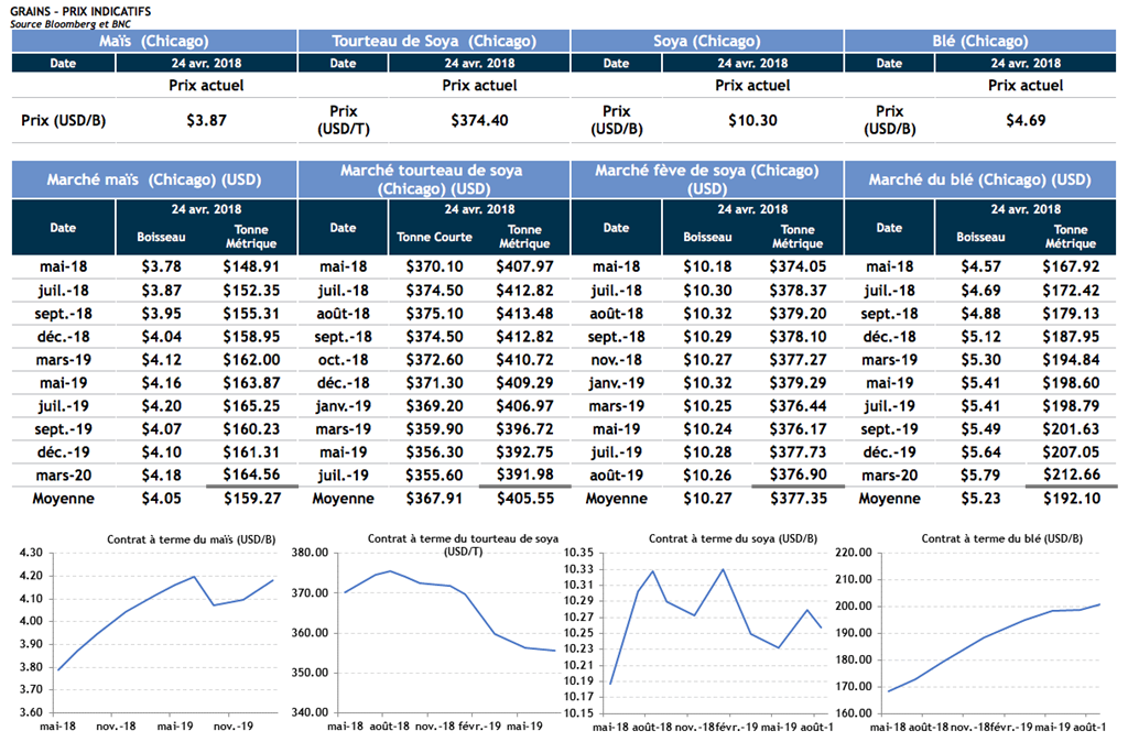 Voici les prix indicatifs des grains et du porc en date de ce matin: