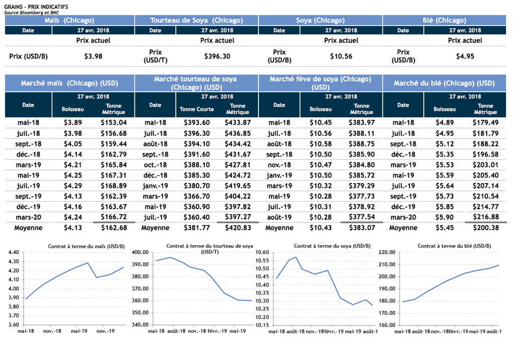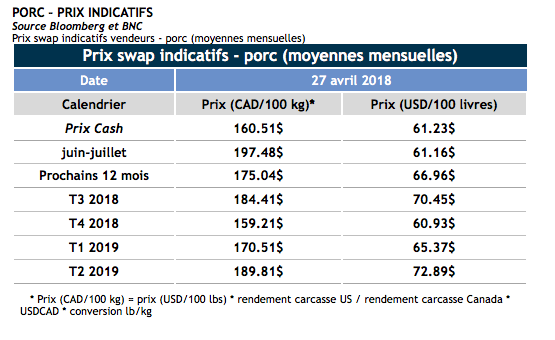 Voici les prix indicatifs des grains et du porc en date de ce matin: