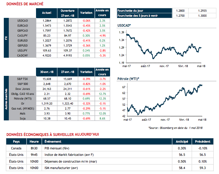 Nous surveillons aujourd’hui le produit intérieur brut au Canada pour le mois de février où une croissance de 2.8 % vs l’année dernière est attendue selon les économistes sondés. Le gouverneur central de la Banque du Canada, Stephen Poloz, discutera de l’endettement des ménages lors d’une allocution à Yellowknife à 14h30. En terminant, le Federal Open Market Committee (FOMC) débute aujourd'hui sa rencontre qui se conclura demain par la décision sur le taux directeur de Réserve fédérale américaine.