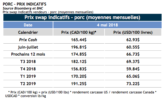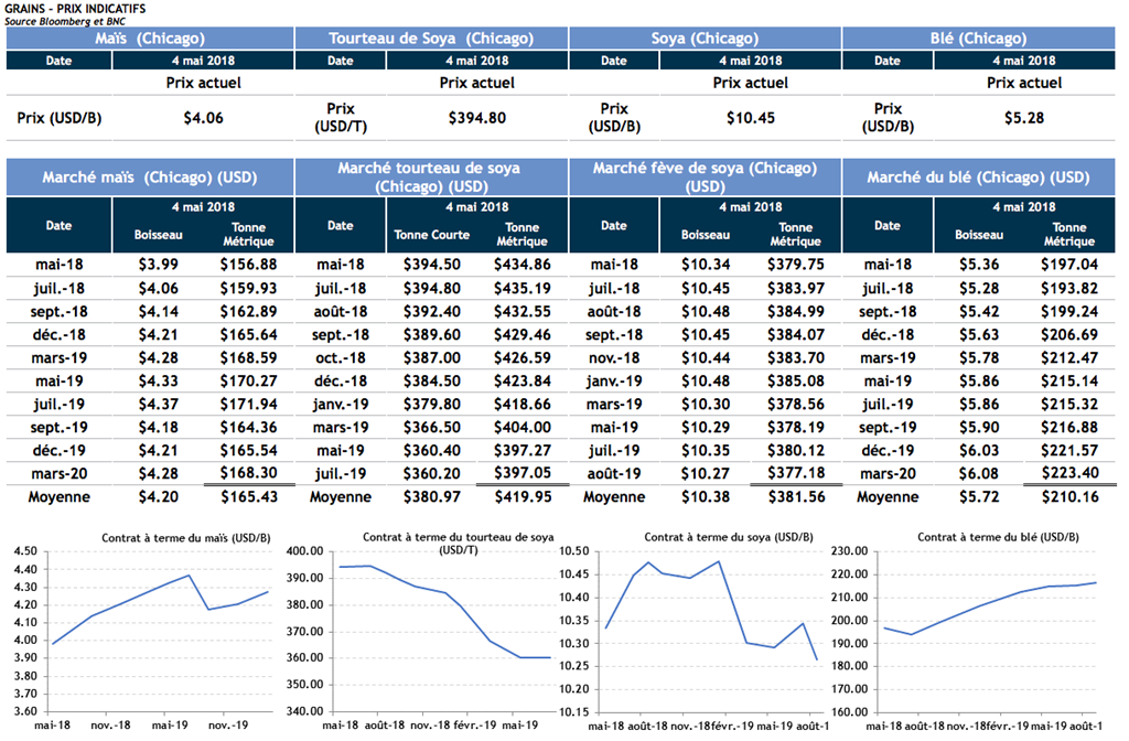 Voici les prix indicatifs des grains et du porc en date de ce matin: