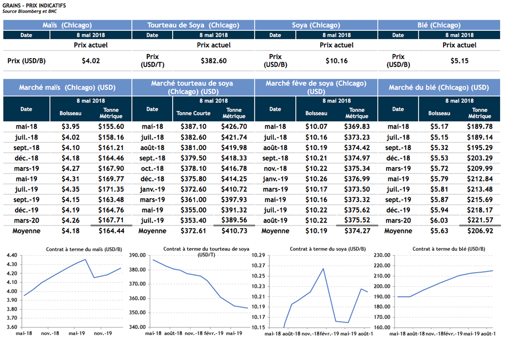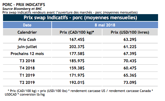 - Le dollar canadien à la baisse améliore la situation sur le prix du porc canadien. Il faudra demeurer attentif aujourd’hui au prix du baril de pétrole. Le Président Trump devrait annoncer ses intentions quant au programme nucléaire de l’Iran cet après-midi.