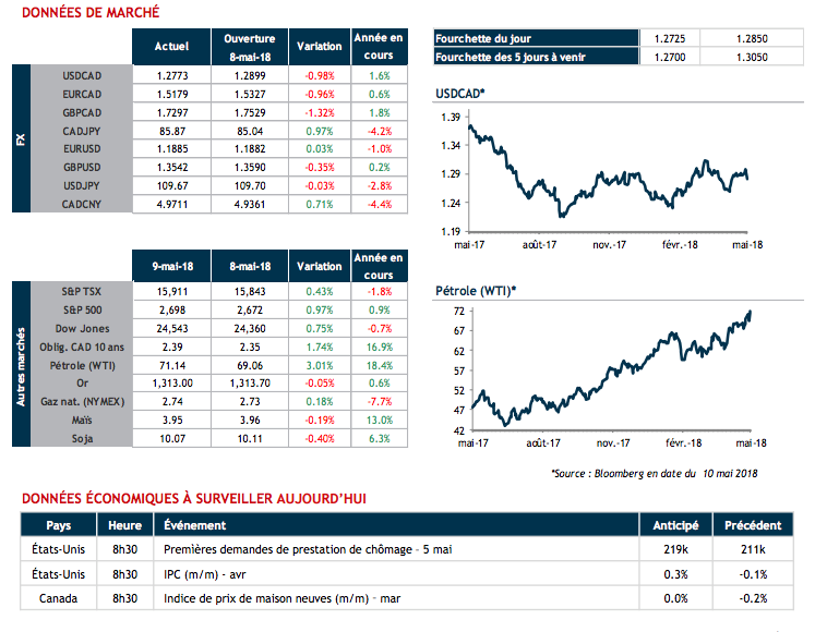 Le pétrole WTI a clôturé la session d’hier en hausse de 3 % propulsé par la décision du président Trump de rompre avec l’accord nucléaire iranien, en plus d’une baisse des inventaires de produits pétroliers aux États-Unis au courant de la semaine précédente. Selon nos économistes, les sanctions américaines contre l’Iran pourraient soustraire jusqu’à 500 000 barils par jour destinés au marché mondial.