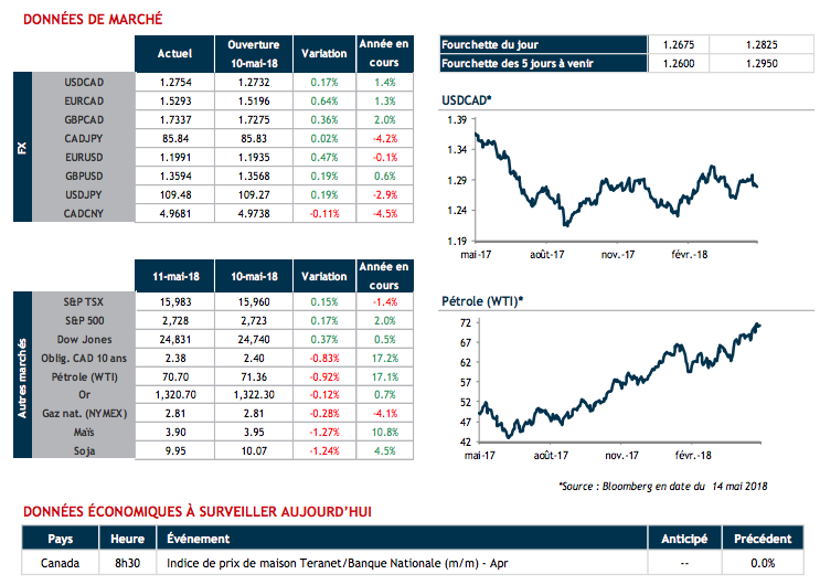 Beaucoup de volatilité est donc à prévoir cette semaine sur le marché des devises et des taux d’intérêt. Nous surveillerons notamment l’évolution du prix du pétrole brut WTI qui est stable ce matin mais en progression de plus de 22% depuis les creux du mois de février dernier. Au niveau économique, la publication de l’indice Teranet/Banque Nationale qui mesure l’évolution des prix de l’immobilier au Canada nous donnera le pouls de l’immobilier au Canada.