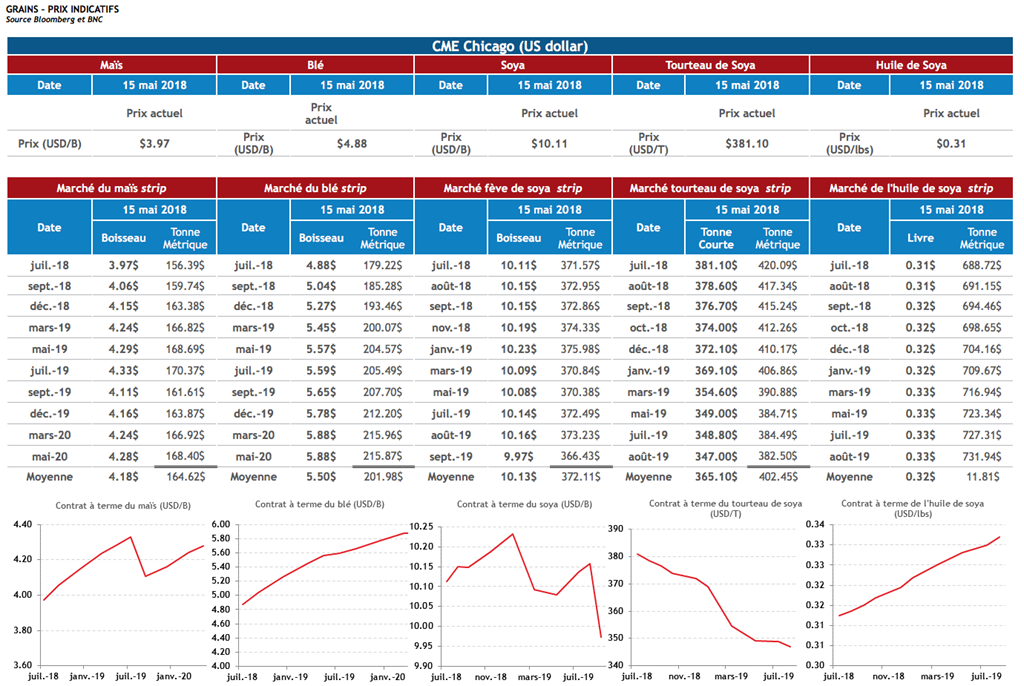 - Le USDA a rapporté que les producteurs américains avaient semé plus rapidement leur maïs et leur soya que les anticipations. En fait, 62% du maïs est déjà en terre et 35 % du soya. Il sera intéressant de suivre la progression des semis de blé de printemps qui tirent de l’arrière se situant à 58% versus une moyenne à 66%. On craint la perte de certaines surfaces sur cette céréale.