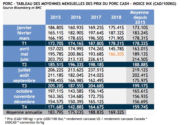 - Au risque de se répéter, le prix de la découpe a encore grimpé hier. Le USDA a rapporté que les grossistes ont fait grimper le prix de $0.69 à $74.24. En fait, la hausse n’est pas spectaculaire, mais le nombre de lots transigés furent très élevés (398 lots de 40 000 lbs). Est-ce un signe que la demande est forte au niveau détail? Le prix du bacon est repassé au-dessus du $1/lb.
