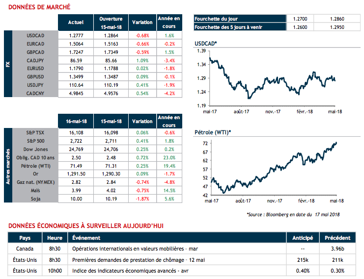 Au niveau économique, nous surveillons la publication demain à 8h30 des ventes au détail pour le mois de mars et l’indice des prix à la consommation (IPC) en avril au Canada. Un niveau d’inflation au-dessus des attentes favoriserait le dollar canadien en laissant entrevoir un resserrement monétaire plus rapide qu’anticipé.