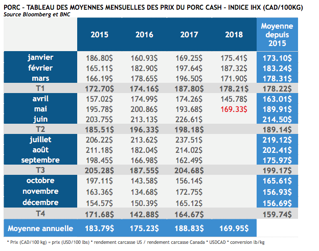 Prix swap indicatifs vendeurs à l’ouverture des marchés - porc (moyennes mensuelles)