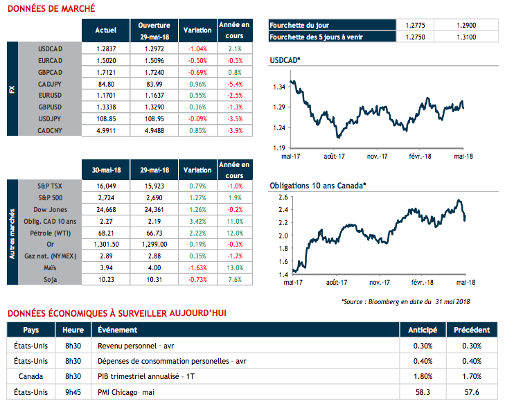 Pas de répit en ce qui concerne les nouvelles économiques canadiennes alors que nous surveillons ce matin le PIB réel pour le premier trimestre de l’année. Les économistes sondés par Bloomberg s’attendent à une croissance de 1.8%. Une croissance dépassant les pronostics rehausserait davantage la probabilité d’une hausse en juillet, ce qui aiderait aussi notre devise.