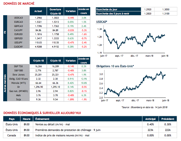 La valeur du USD a aussi réagi en 2 temps, hausse puis baisse mais est restée dans les bornes bien connues face au CAD (1.2950-1.3050).