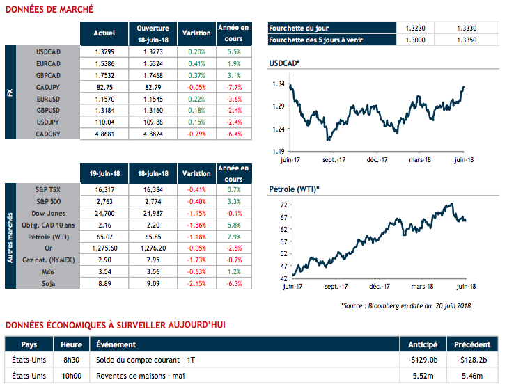 Un sentiment d’aversion au risque s'est emparé des marchés hier suite à l’escalade des tensions commerciales. Généralement éprouvé par un tel environnement, le huard a de nouveau perdu des plumes atteignant son plus faible niveau des 12 derniers mois. Les sources de pression sur notre devise s'accumulent telles que la menace Trumpienne contre l’ordre économique mondial, les déboires de l’ALÉNA ainsi qu’une potentielle hausse de la production pétrolière par l’OPEP et la Russie.