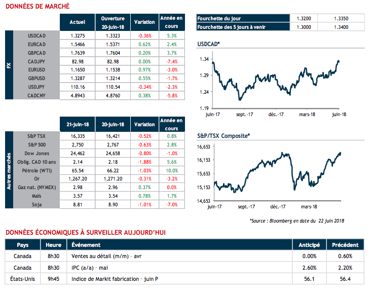 Entre temps, quelques représentants américains chercheraient à reprendre les négociations avec leurs homologues chinois dans ce qui semble être une tentative désespérée de sauver le commerce international avant le 6 juillet, date de mise en place des tarifs américains. Si toutefois les pourparlers ne progressent pas, la Chine devra adopter d’autres moyens afin de contrer les mesures protectionnistes. Un des outils à leur disposition serait une dévaluation de leur devise de manière à demeurer compétitive et de pouvoir combattre la hausse des prix provoquée par les tarifs. Rappelons qu’en 2015, la Banque populaire de Chine avait surpris les investisseurs avec 3 dévaluations de leur devise, ce qui avait causé des turbulences importantes dans les marchés.