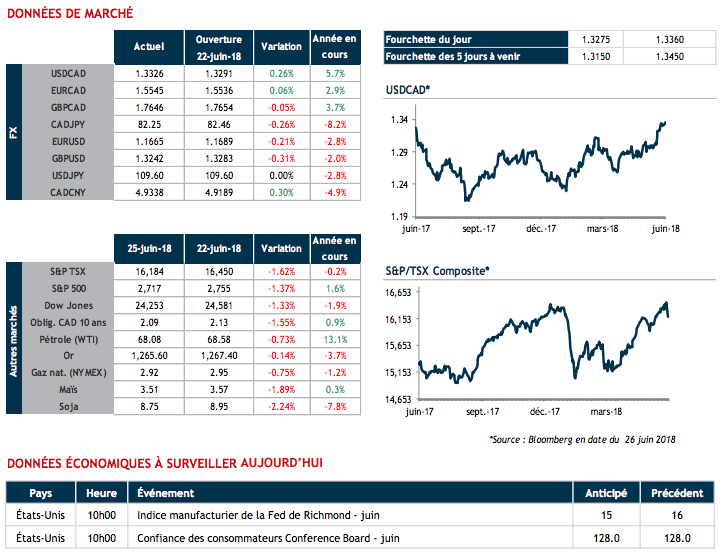 Alors que les négociations n'ont pas été en mesure de changer l'opinion du président Trump, reste à voir si une correction boursière pourrait l'obliger à revoir son plan économique! La nervosité reste palpable ce matin. Le dollar américain est en progression alors que nous surveillons la confiance des consommateurs américains à 10h.