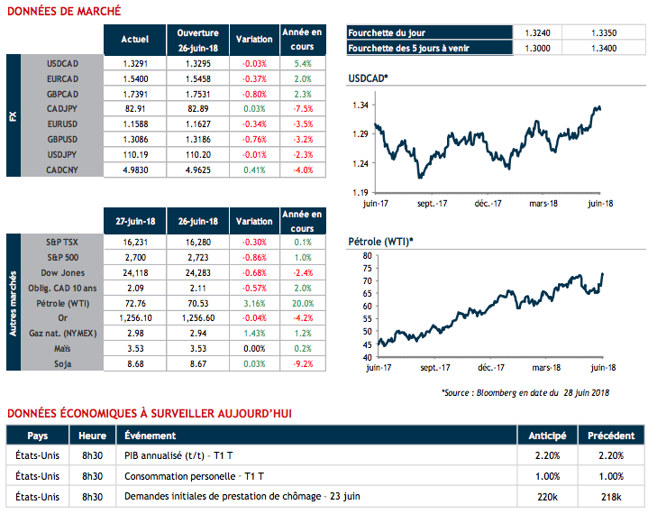 Nous avons eu droit à une autre séance très volatile hier pour le dollar canadien. Le gouverneur de la Banque du Canada (BdC), Stephen Poloz, a déclaré qu’à l’approche de la prochaine décision (11 juillet prochain), la BdC travaillait à incorporer à ses modèles l’effet des tarifs américains sur l’économie canadienne ainsi que l’évolution du marché immobilier au Canada. Après avoir perdu du terrain hier, le dollar canadien est en légère progression ce matin tandis que les investisseurs chiffrent maintenant à 50% les probabilités d’une hausse de taux en juillet prochain.