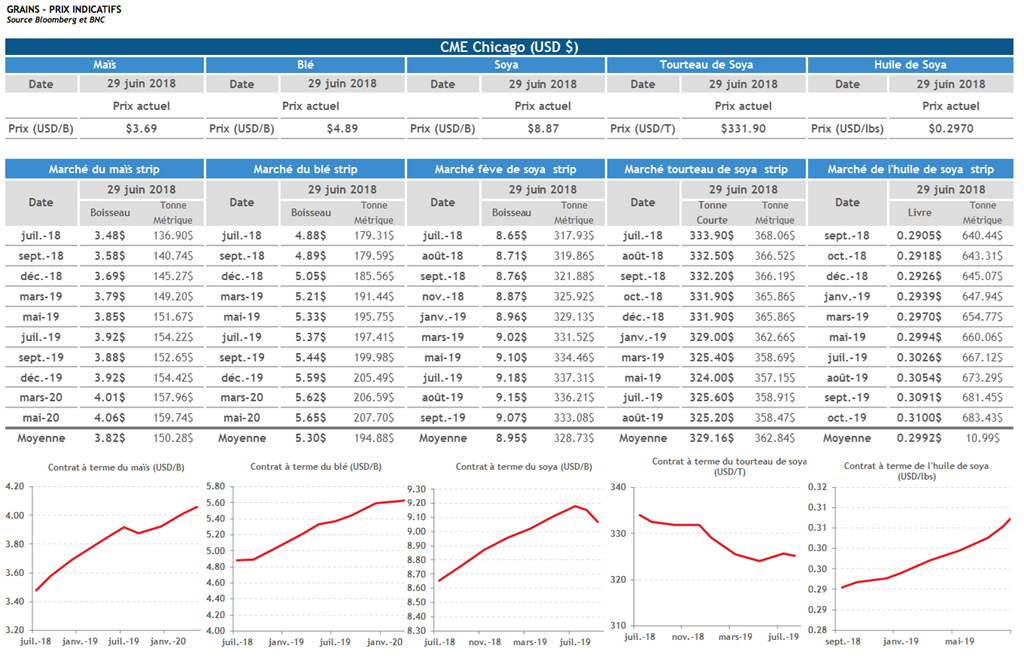 - SOYA : Le marché reste dans une tendance baissière abrupte et aura besoin de l'aide de la météo, d’un revirement avec les tensions commerciales avec la Chine ou bien d'une surprise dans les rapports de USDA pour voir une reprise rebondir.