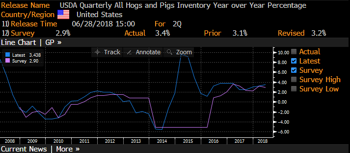 - Les inventaires de porcs américains pour le 2e trimestre de 2018 sont en hausse de 3.4% par rapport à 2017, un record historique à 73 451 000 têtes (voir graph ci-dessous)