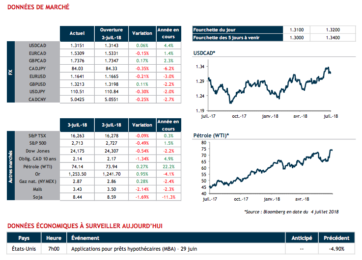 Il va donc sans dire que l’annonce a surpris le marché, lui qui voyait dans le contexte actuel un feu vert au recul du Yuan. Curieusement, cette situation n’aura dicté aucune direction aux différentes classes d’actifs alors que les bourses américaines ainsi que le baril de pétrole brut (WTI) ont fait le yoyo. Parions que la session écourtée en raison du congé aux États-Unis du 4 juillet aujourd’hui y était pour quelque chose.