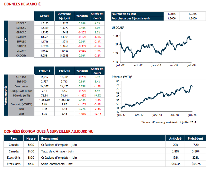 Comme on pouvait s’y attendre, le procès-verbal de la dernière rencontre de la Réserve fédérale américaine confirme que, là aussi, on s’inquiète des conséquences potentielles d’une guerre commerciale. D’ailleurs, en riposte aux tarifs américains qui sont entrés en vigueur ce matin, la Chine n’a pas tardé à annoncer qu’elle fera de même. Qu’à cela ne tienne, l’ensemble du contexte économique actuel chez nos voisins du sud demeure suffisamment robuste aux yeux du marché pour de nouveaux resserrements monétaires. À ce jour, les probabilités d’une hausse de taux le 26 septembre prochain sont à plus de 80% et de 100% pour deux hausses d’ici mars 2019.