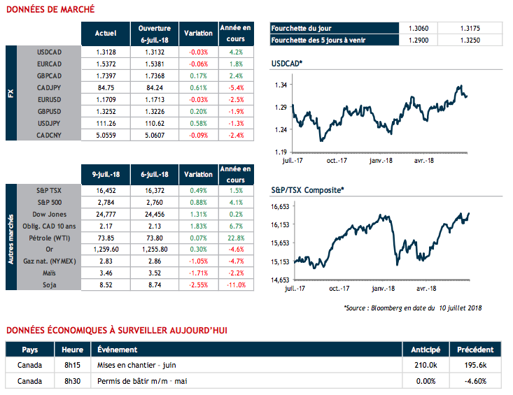 Nous surveillons ce matin les publications des mises en chantier et des permis de bâtir afin d’évaluer l’état du marché immobilier canadien. Nous recommandons à nos clients de profiter de cette journée qui s’annonce calme pour laisser des ordres dans le but de bénéficier de la volatilité du dollar canadien attendue demain.