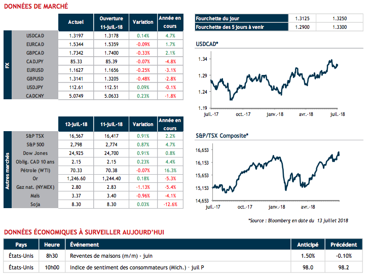 Les marchés se sont stabilisés hier après la chute importante provoquée par les tensions commerciales entre la Chine et les États-Unis. Soutenu par les données sur l’inflation, le dollar US a gagné du terrain jeudi contre plusieurs devises, incluant le huard. En effet, l’indice des prix à la consommation aux États-Unis confirme que le coût de la vie a grimpé de 2,3% en juin, légèrement au-dessus de la cible de 2% de la banque centrale américaine.