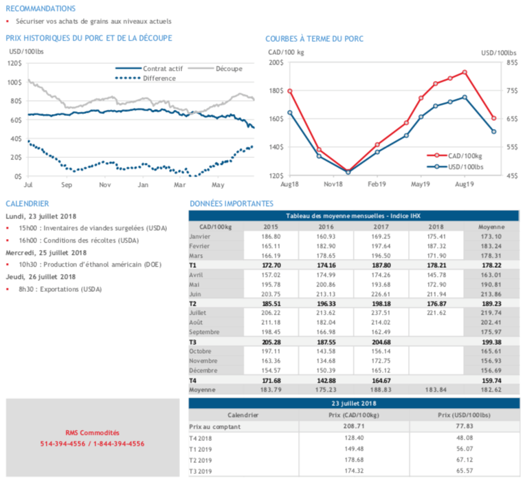 - Le marché semble demeurer en attente d’un quelconque signal pour reconsidérer la tendance actuelle, mais les nouvelles positives se font très rares. Le marché surveillera aujourd’hui les inventaires de viandes surgelées pour le mois de juin. Les discussions entre les États-Unis et le Mexique pourraient mettre un fin à la dégringolade à court terme.