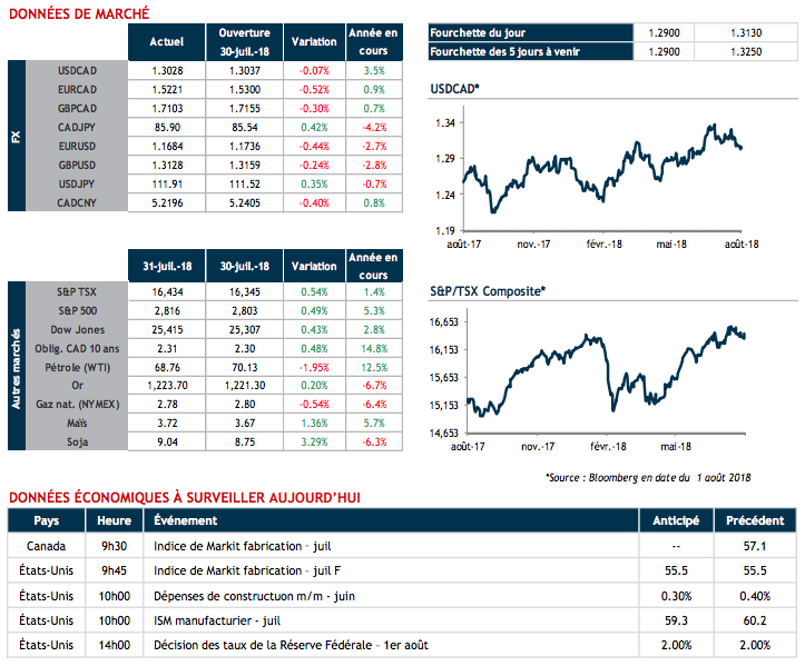 Nous surveillons aujourd'hui l’ISM manufacturier aux États-Unis, les inventaires américains de produits pétroliers à 10h30 ainsi que la décision de taux directeur de la Réserve fédérale à 14h. Le dollar canadien est stable ce matin tandis que le pétrole brut est en repli.