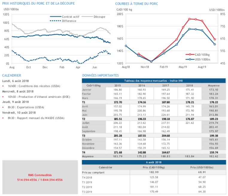 - Le marché continue d’escompter une forte baisse des prix, le contrat d’octobre se transigeant 20.33 USD sous le marché au comptant. Advenant une résolution du différend entre les États-Unis et le Mexique, le marché pourrait être tenté d’aller rejoindre la moyenne des 5 dernières années, à 15.60 USD.