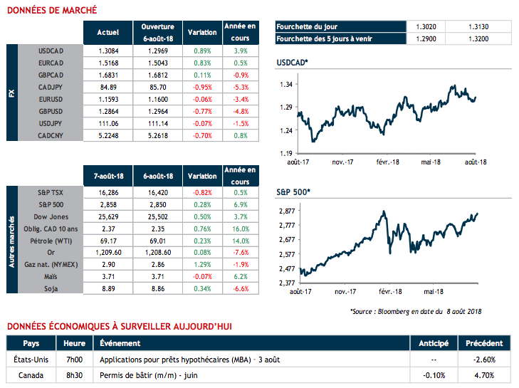 Après avoir franchi à la baisse le support de 1.3000, la paire USDCAD a subi un rebond technique pour s’accroître d’une centaine de points. La faiblesse du huard fut principalement provoquée par la hausse des taux obligataires américains ainsi que par la chute de l’indice des directeurs d’achats canadiens, ce qui peut être interprétée comme une potentielle décélération de la production. La réaction négative du CAD fut amplifiée par le contexte actuel d’incertitude commerciale.
