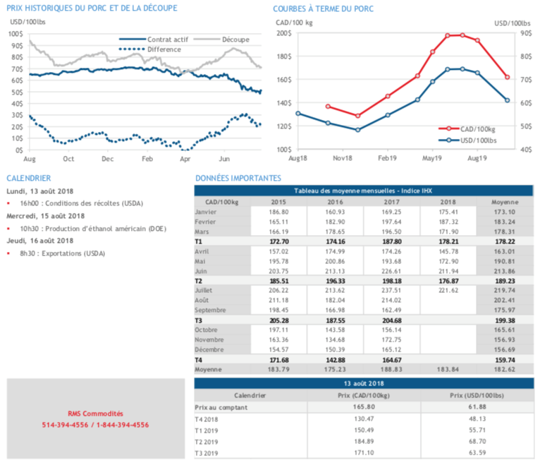 - Dans son dernier rapport mensuel, le USDA a revu à la baisse la production de porc pour la fin de l’année 2018 (de 26 759 à 26 723 millions de livres) et les exportations pour 2018 et 2019, mais à la hausse la production pour 2019, de 27 714 à 27 889 millions de livres.