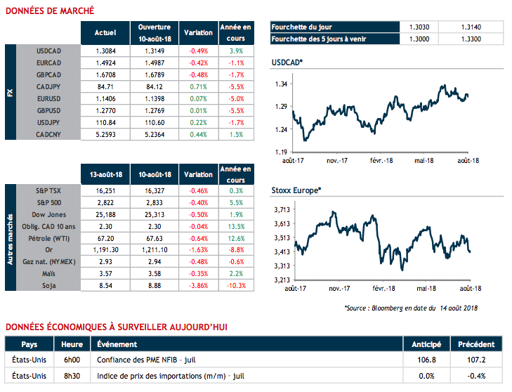 La situation en Turquie a continué d’animer les marchés lundi, guidant les bourses internationales vers des reculs. Les bourses européennes furent plus durement touchées, considérant l’exposition des banques de la région à la Turquie. Tel que souligné par nos économistes, les banques espagnoles (80G USD), françaises (38G USD), britanniques (19G USD) et américaines (18G USD) sont les plus exposées à l’économie turque.
