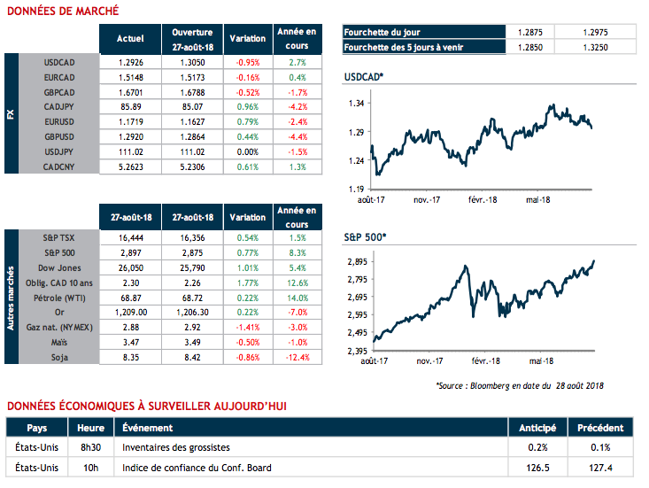 Le dollar canadien et le peso mexicain ont gagné tout près de 0.45% et 0.77%, respectivement, lundi suite à l’annonce d’un accord bilatéral conclu entre les États-Unis et le Mexique afin de moderniser l’ALÉNA. Selon l’entente, l’une des clauses majeures repose sur l’industrie automobile: 40 % à 50% du contenu des véhicules vendus en Amérique du Nord devront provenir d’usines où le salaire des travailleurs est d’au moins 16$ de l’heure. Cette entente vise essentiellement à limiter la capacité du Mexique d’attirer des usines avec des employés gagnant 4$ de l’heure.