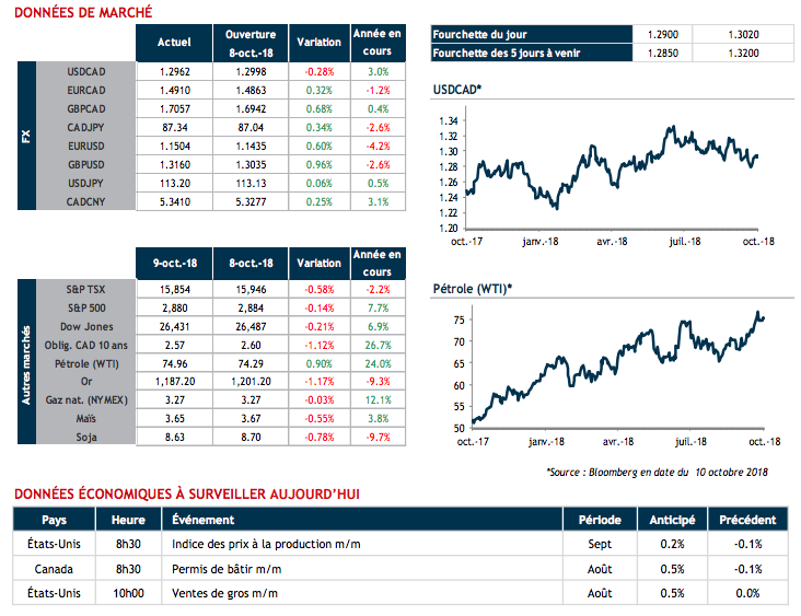 Les marchés se sont calmés mardi alors que les investisseurs ont fait signe de patience. Le rendement sur les obligations américaines 10 ans a atteint 3.26%, le plus haut niveau depuis 2011, avant de rebrousser chemin pour terminer la séance en légère baisse. Les bourses et le dollar US ont été relativement stables. Quant au dollar canadien, il a ignoré la force du pétrole tel que mesuré par le cours du brut WTI qui a dépassé 75$. L’agence internationale de l’énergie a noté hier que le marché du pétrole risque d’entrer dans une zone dangereusement élevée si les pays producteurs, incluant l’OPEP, n’augmentent pas leurs niveaux de production.
