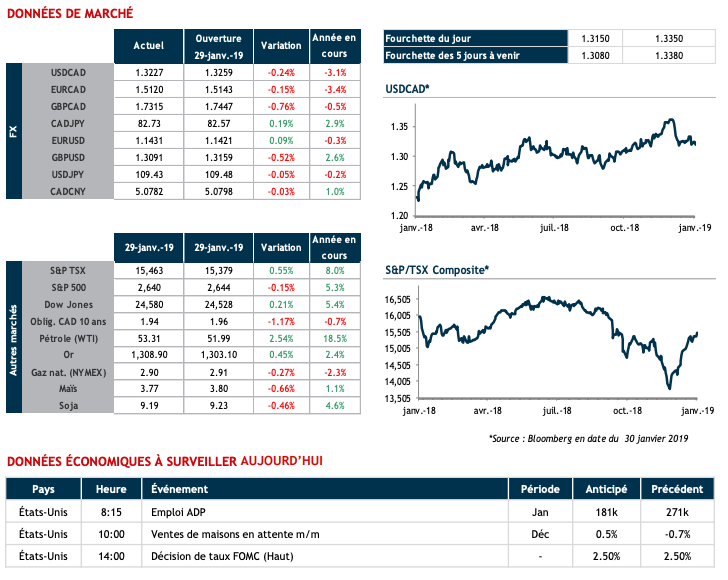 La Réserve fédérale américaine (Fed) rendra sa décision aujourd’hui à 14h. La conférence de presse aura lieu à 14h30. On n’attend pas de hausse de taux et le ton de M. Powell devrait être semblable à celui de la dernière rencontre : en l’absence d’inflation et étant en fin de cycle économique, la Fed entend mettre un terme temporaire à sa série de hausses de taux. L’USD pourrait faiblir.