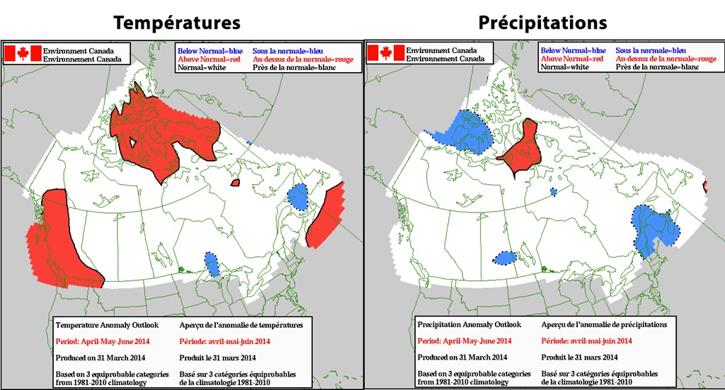 Selon les prévisions Environnement Canada pour les mois d’avril-mai-juin, les températures seront près des normales de saison et les précipitations devraient se situer sous la normale.