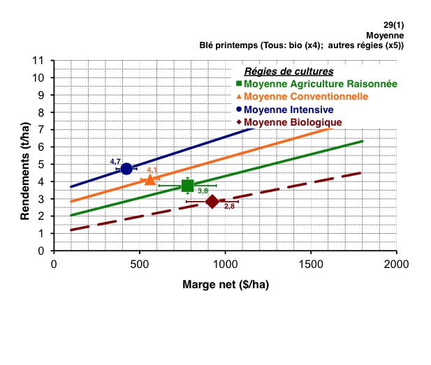 Pour le blé de printemps, la marge obtenue en AR est de 600 $/ha avec un rendement de 3.5 t/ha alors qu’en conventionnelle le rendement est de 4.3 t/ha et de 5.4 t/h en intensive. Voir le graphique 2.