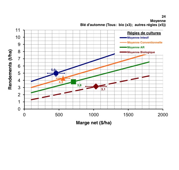 Ainsi le blé d’automne en régie AR donne un rendement de 4t/ha et procure une marge de 800 $/ha. Pour obtenir la même marge en production conventionnelle et intensive le rendement devra être de 5 t/ha et de 6 t/ha respectivement. Voir le graphique 1.