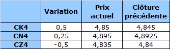 Rien de nouveau dans le marché du maïs, qui demeure dans sa fourchette établie le mois dernier; le contrat de mai (CK) a clôturé à l'intérieur de 0,13$ pour la 17e séance consécutive hier. La situation devrait persister au moins jusqu'à lundi, mais les prix devraient sortir de cette fourchette lundi après-midi à la suite de la publication du rapport. Le marché s'attend à une correction de l'utilisation dans le secteur de l'alimentation animale.