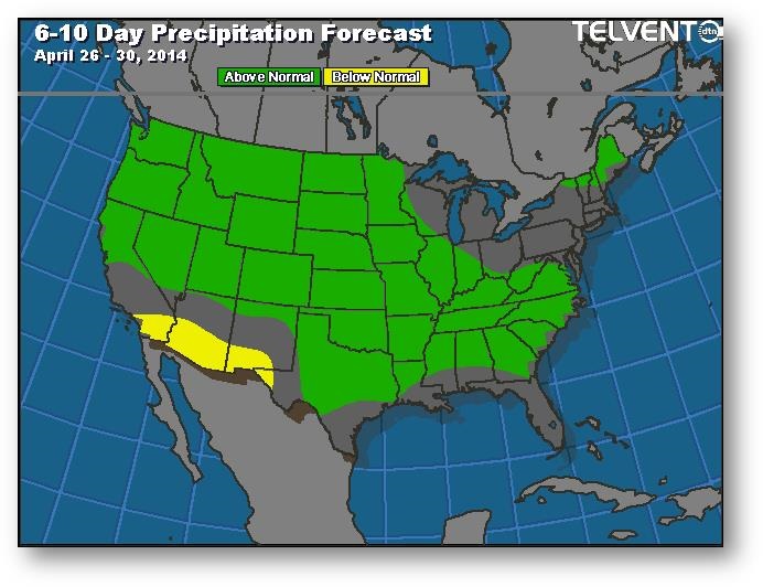 Nous reprenons les choses où nous les avons laissées la semaine dernière : léger affaiblissement des prix, amélioration des prévisions météo et diminution des exportations. Les principaux acheteurs ont été le Japon, Israël et la Corée. La météo semble favorable à la poursuite des semis et on s'attend à ce que la progression soit évaluée à 8% comparativement à 3% la semaine dernière et à la moyenne de 14% des cinq dernières années. Aussi, la situation s'est un peu calmée en Ukraine, ce qui ajoute au sentiment baissier.