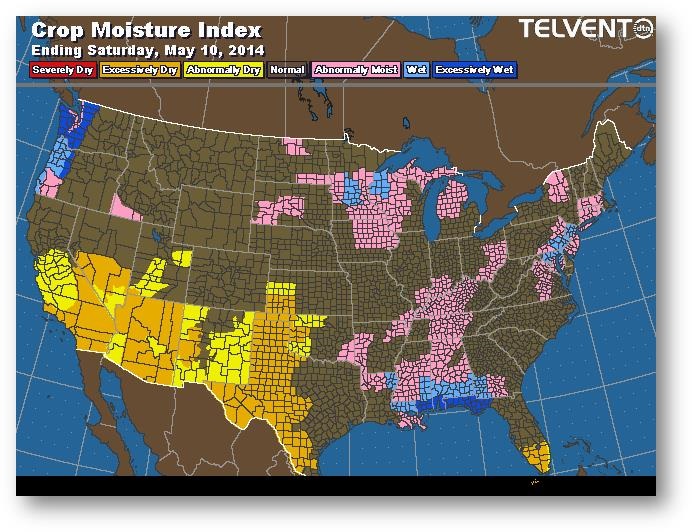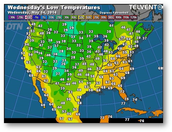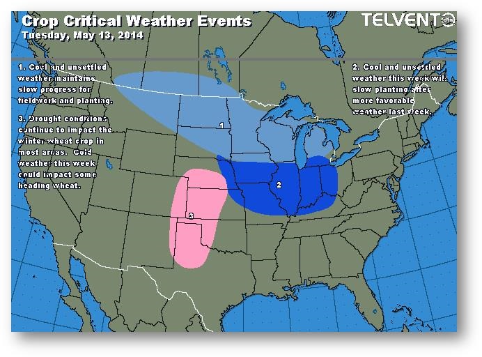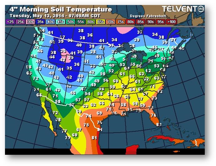 Hier, la progression des semis a été évaluée à 59% comparativement à 29% la semaine dernière et à 58% pour les cinq dernières années. L'avancée a été marquée dans la partie centrale de la Corn Belt, notamment en Iowa (de 47% à 70%). L'Illinois a vu une augmentation importante de 35% à 78%. Les états du nord de la Corn Belt continuent de traîner de la patte; le Dakota du Nord n'a semé que 3% de son maïs (moyenne de 33%) et le Minnesota seulement 31% (moyenne de 62%). Les travaux dans les champs ralentiront sûrement cette semaine en raison des précipitations. On s'attend à ce que le résultat de la semaine prochaine avoisine les 75%.
