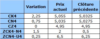 Hier, le contrat de juillet (CN4) a réussi à traverser la moyenne mobile à 50 jours et à clôturer au-dessus. L'indicateur a donc représenté un niveau de support initial au cours de la nuit et ce matin. Le marché a testé les creux de début mai, mais la dynamique baissière n'était pas suffisamment forte; les prix ont rebondi de belle manière grâce à des achats techniques. Les anciens creux et les anciens sommets seront des niveaux clé à surveiller. La fourchette entre le creux du 31 mars et le sommet du 9 avril demeure la caractéristique marquante du graphique.