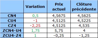 La liquidation du contrat de juillet (CN) et le préroulement des fonds indiciels ont exercé de la pression sur le marché, notamment sur les écarts. Les conditions météo demeurent favorables pour les cultures. Hier, la production d'éthanol annoncée était de 938 000 barils/jour comparativement à 927 000 la semaine prédécente, ce qui est supérieur de 6% au résultat d'il y a un an et qui correspond à une utilisation annuelle de 5280 millions de boisseaux. Depuis le début de la campagne agricole, l'utilisation moyenne équivaut à environ 5070 millions de boisseaux. Le contrat de décembre (CZ4) devrait continuer à subir de la pression puisque les prévisions de rendement continuent d'augmenter.