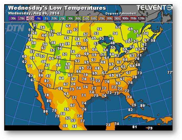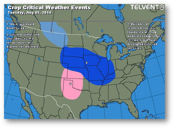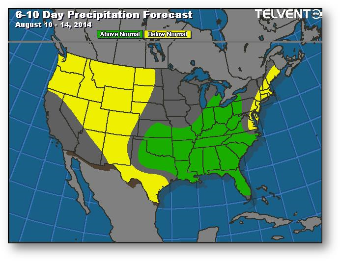 Les prix du maïs semblaient vouloir suivre ceux du soja. Les modèles météo ne présentent pas les mêmes prévisions. Les exportations étaient de 44,9 millions de boisseaux, ce qui est supérieur à la moyenne hebdomadairede 35 millions nécessaire pour les quatre prochaines semaines en vue d'atteindre la prévision du USDA de 1900 millions de boisseaux. Le blé a inondé le marché international de l'alimentation animale, ce qui fait trébucher la demande de maïs. L'Ukraine sera la plus touchée. FC Stone a évalué le rendement à 172,4 boisseaux par acre pour les États-Unis.