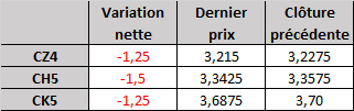 Le contrat de décembre (CZ4) a commencé à tester sa ligne de tendance descendante majeure qui supporte le marché depuis mai. Si les prix devaient chuter sous cette ligne de tendance, on pourrait voir de nouvelles couvertures de positions courtes et peut-être le test de la moyenne mobile à 50 jours à 3,53$. De l'autre côté, un renversement à la hausse semble peu vraisemblable pour l'instant.