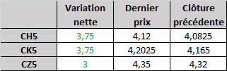 Les prix du maïs ont atteint de nouveaux sommets de cinq mois au cours de la nuit, suivant le blé à la hausse. Hier, la production d'éthanol annoncée pour la semaine dernière était de nouveau record. La Chine a quant à elle annoncé qu'elle autoriserait l'importation en vrac du maïs MIR-162. Les fonds, qui ont une position anormalement longue, ne cherchent pas à s'en départir, pour l'instant, vu la combinaison des nouvelles fondamentales et les gains dans le blé. La situation fondamentale semble haussière à court terme et quelques indicateurs techniques laissent présager un autre redressement. Dans le cas du contrat de mars (CH5), l'écart du graphique de juillet, la moyenne mobile à 200 jours et le retracement de Fibonacci à 50% se situent tous entre 4,22$ et 4,26$. Dans le cas du contrat de décembre (CZ5), le niveau de résistance se situe ce matin à la moyenne mobile à 200 jours à 4,37$.