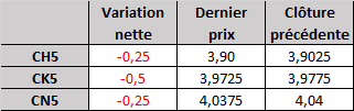 La hausse d'hier, quoique légère, a poursuivi son chemin au cours de la nuit. D'un point de vue technique, le niveau de support et la moyenne mobile à 100 jours se sont maintenus, ce qui a encouragé l'intérêt acheteur des utilisateurs finaux. Les inspections à l'exportation ont révélé un résultat de 29,4 millions de boisseaux. Les États-Unis ont perdu quelques ventes au profit de l'Ukraine. Les prix semblent se maintenir à l'intérieur de la fourchette, en attente d'un catalyseur à la hausse ou à la baisse. Le marché du blé pourrait entraîner celui du maïs dans son sillon; à surveiller.